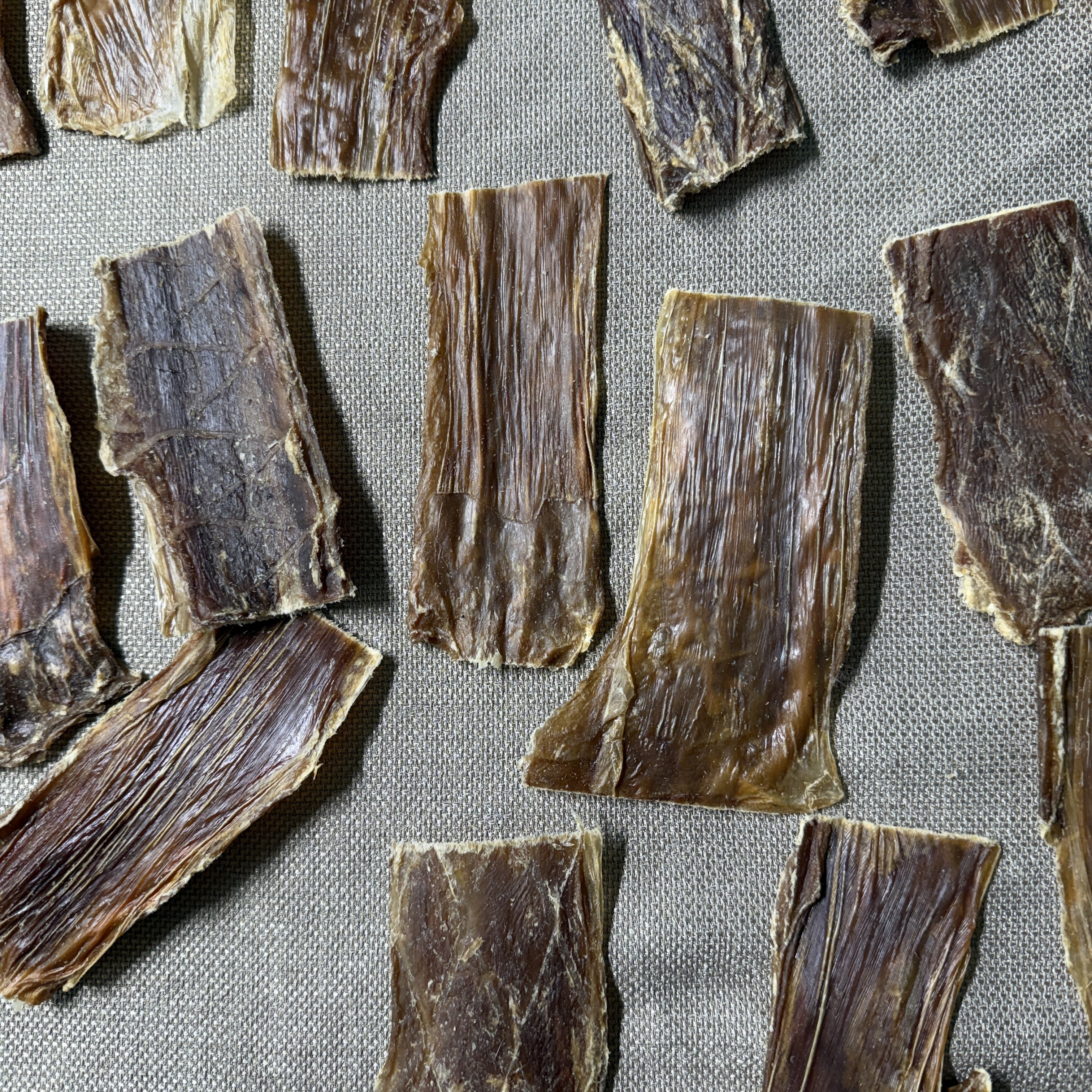 Ethically sourced and made from 100% South American beef esophagus. These chews have a flat, “jerky like” texture and shape. Esophagus is a unique source of chondroitin and glucosamine, which both promote healthy joints. Easy to digest, high in protein and low in fat. No additives, fillers, hormones, chemicals or preservatives.