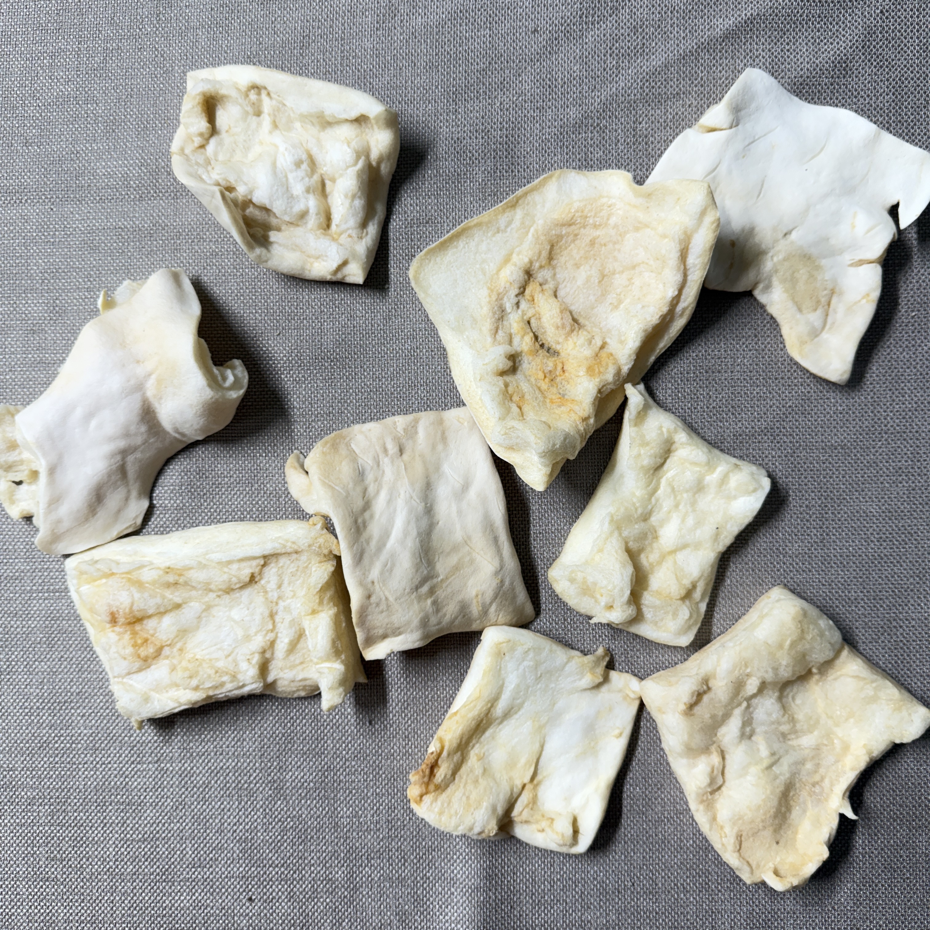 These cheek chips are slowly baked to perfection. They're very spongy, contain a creamy white color, and full of pawmazing flavor. It's a great treat for ALL chewers to entertain them while helping to scrub off tartar and plaque from their teeth.